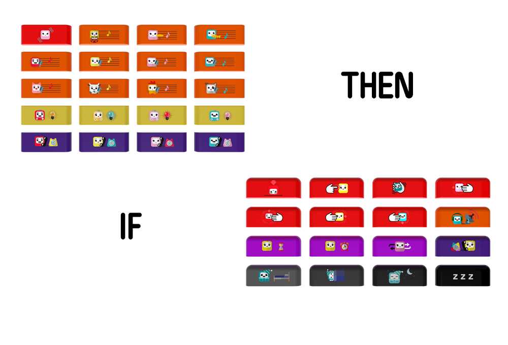 La mitad de las fichas indican el condicionante (IF) y la otra mitad, la consecuencia (THEN). Eligiendo correctamente la combinación de las dos fichas, se podrá establecer una norma lógica y el robot actuará según lo indicado.